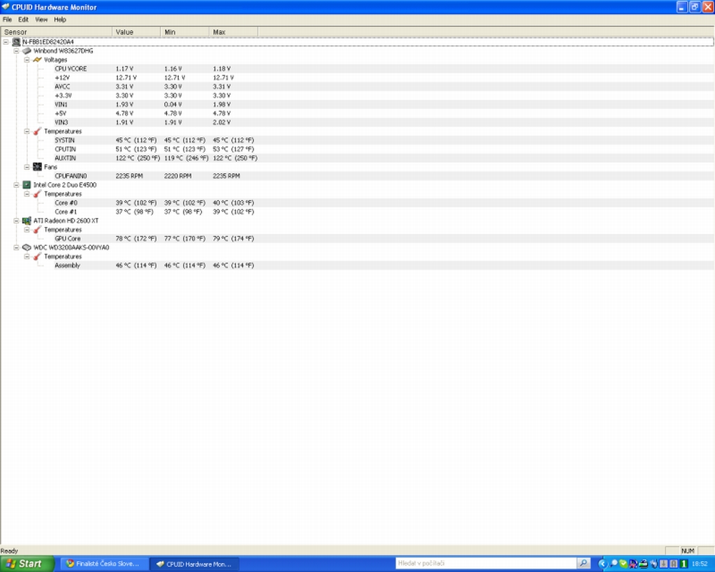 Těch 122 je určitě chyba čidel, ukazuje mi to tolik už hodně dlouho a s počítačem jsem nic neměl. A obrazovku bych mohl vyzkoušet o víkendu, jestli to nebude něčím jiným. Intel Core2 E4500 2,2 GHz, ATI Radeon 2600, 2Gb RAM, Windows XP Home edition....