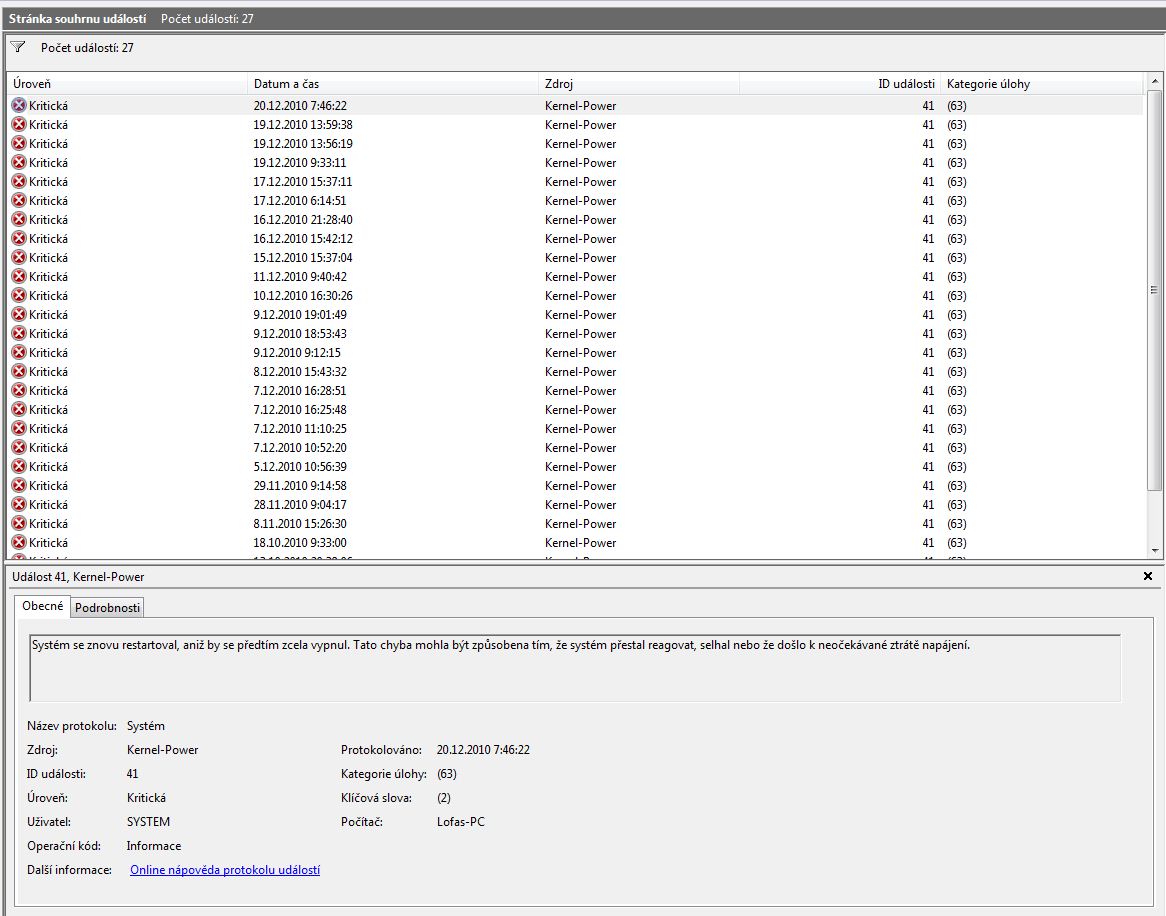 V cca. 18:00 udělám výše uvedené testy. Začalo se to dít pár dní zpět. Ale nepředcházelo tomu nic neobvyklého. Zatím se to stalo asi cca. 3 - 4x v průběhu 10 dní.
