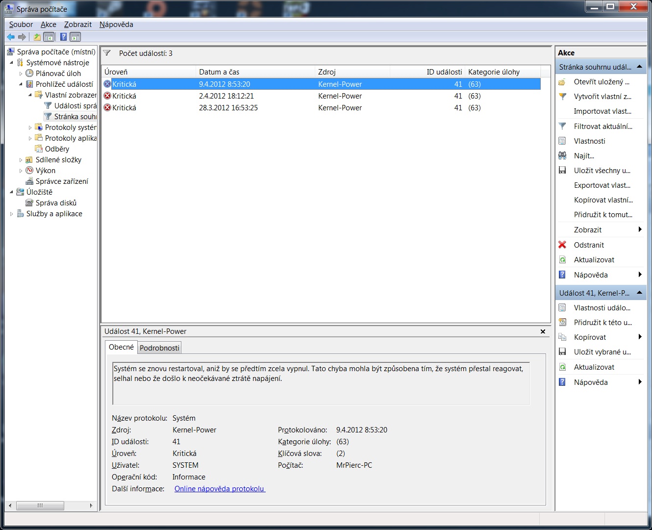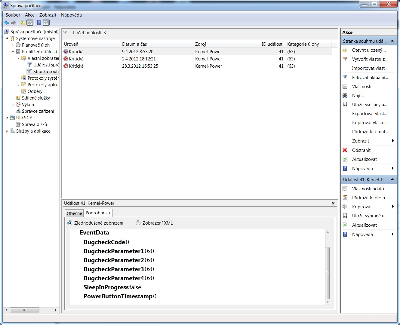 9.4.2012 = Updatoval jsem BIOS, nejnovější ovladače CPU, USB 2 a 3. Chyba stále přetrvává. Mám spíše podezření na nekompatibilitu komponentů. Přikládám screenshoty = Kernel-Power 41 (63) error. Mám někam nahrát i protokol událostí?