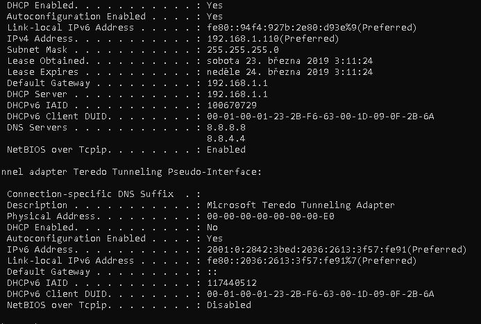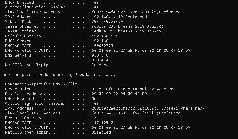 Bude mě zajímat výpis ipconfig /all při funkční i nefunkční wifi.