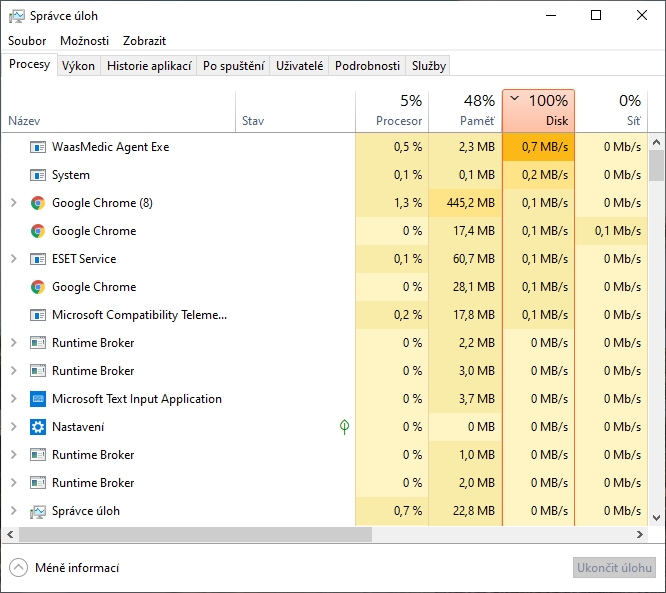 Jak je vidět, žádný z procesů se nezdá, že by disk vytěžoval nějak extrémně, přesto je tam 100% výkon.