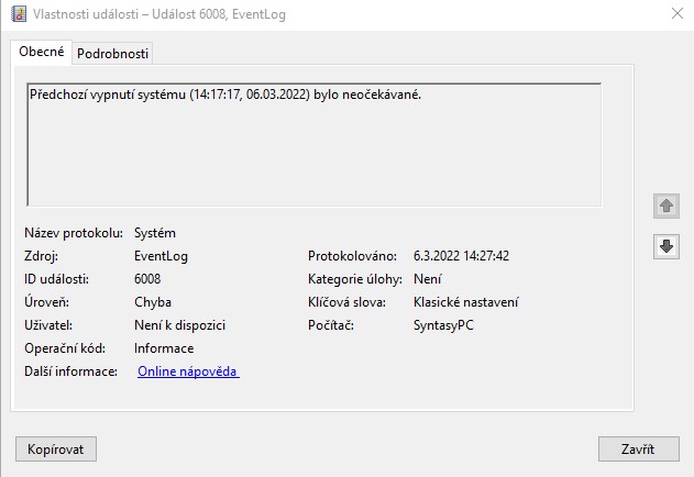 Co konkrétně mám hledat? Jediné co to v událostech píše je chyba 6008 vypnutí systému bylo neočekávané.