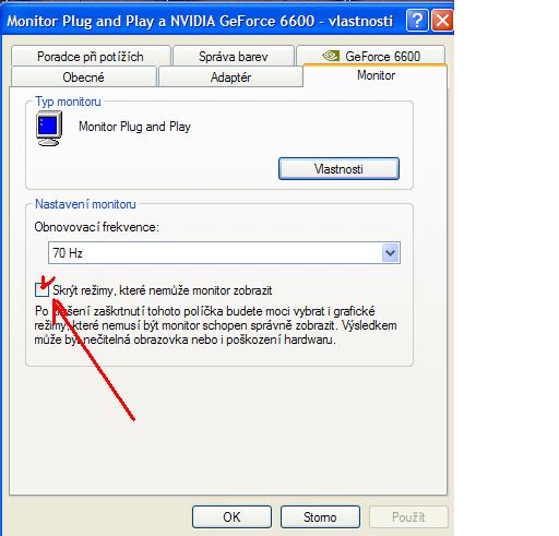 Pravou myší na Plochu a vybrat Vlastnosti - Nastavení - Upřesnit - Monitor, a zde zaškrtnout.