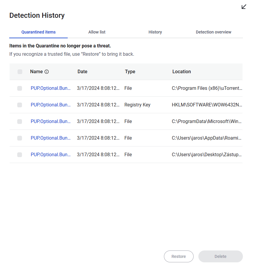 Jinak mi Malwarebytes už nic nenašel viz screen. V karanténě jsou nějaké soubory viz screen.