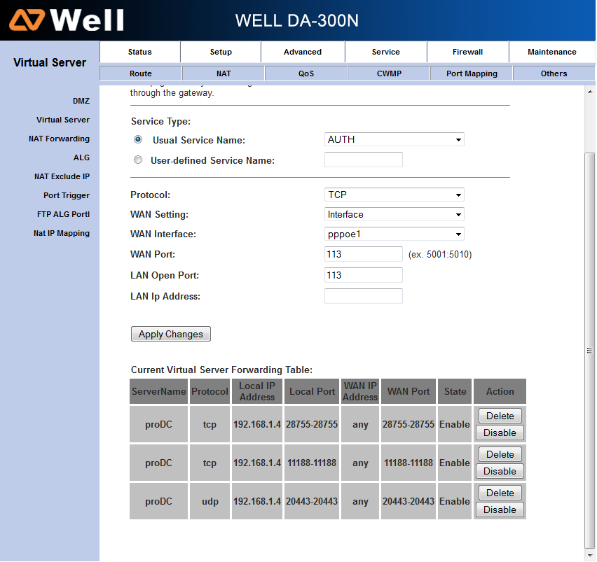 - tady jsem musel jít do Advanced->NAT->Virtual Server, a pak jsem nastavil následující:
