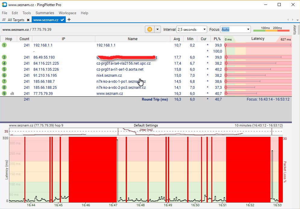 Tak při pingování Seznamu.cz mě připojení odumřelo. Jinak ten Pingploter ukázal docela děs běs.