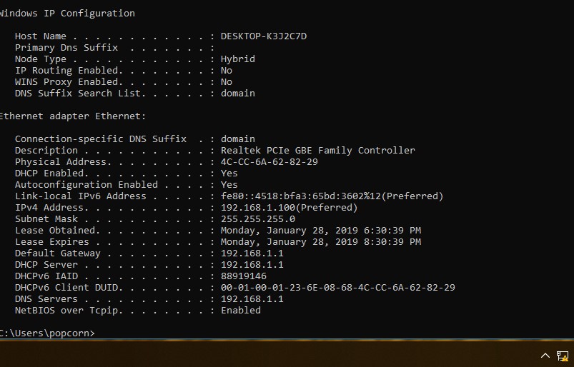 Host Name . . . . . . . . . . . . : DESKTOP-K3J2C7D