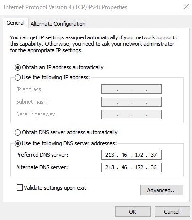 DNS Servers . . . . . . . . . . . : 213.46.172.37
