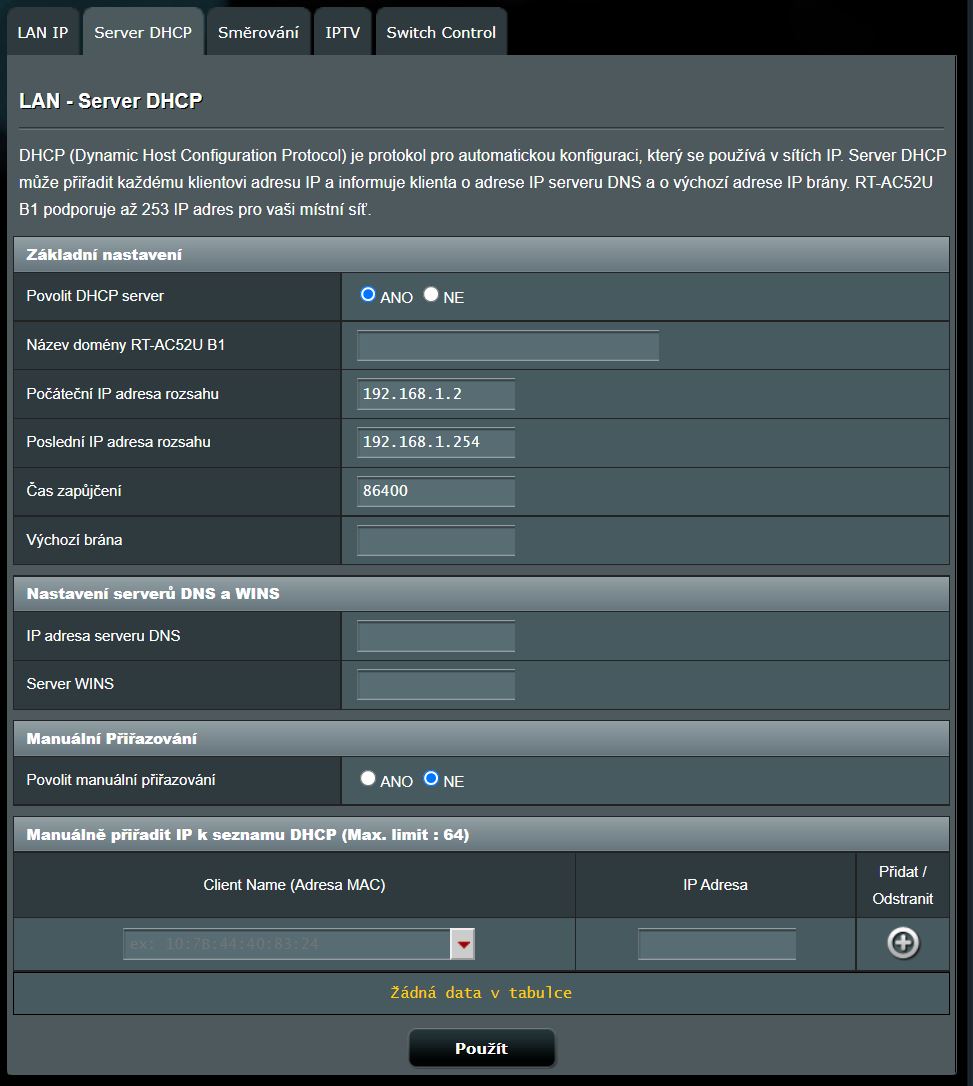 Router Asus vlastním. Takže DHCP se nechá zapnutá a v tedy v rozsah 192.168.1.100-200 bude pro jakákoliv nově připojená zařízení a rozsah třeba 192.168.1.2-99 vyberu pro ta pevná zařízení, s kterými se většinou nijak nemanipuluje.