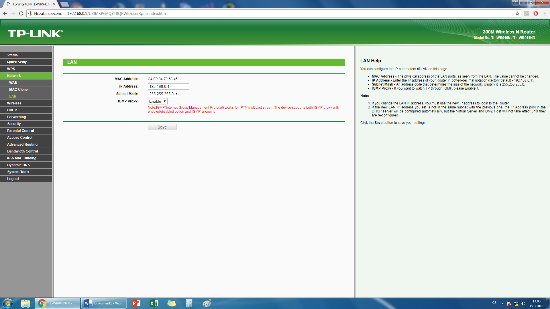 Např. v mobilu vidím, připojím se, ale nejde. V pc WiFi kartu nemám, ten připojím přes kabel, po připojení je u té ikonky žlutý trojúhelník (je to vidět na těch screenech), jinak vše na routeru svítí jako normálně. Jinak firmware stáhnu zde ano https://www.tp-link.com/cz/download/TL-WR940N_V5.html jen si tam mám vybrat tu verzi. Na routeru mám V5, ale obrázkově mi odpovídá V1 a V2 no.