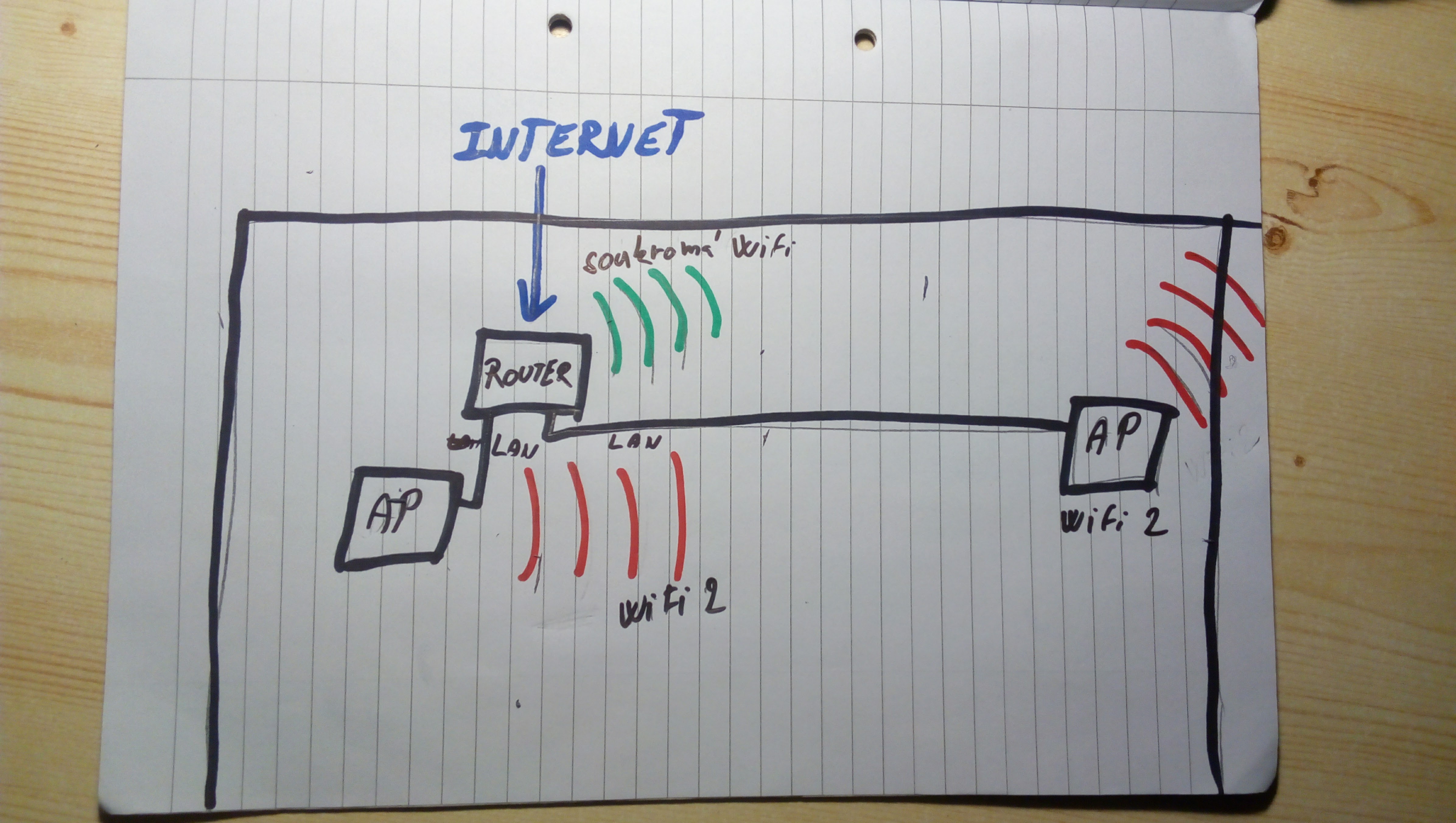 potřeboval bych poradit s nastavovanim Wifi sitě. Mám v jedné mistnosti Wifi router s přívodem internetu a wifi mám základně nastavenou a potřebuji vyvést z tohoto routeru LAN kabel do Access Pointu (AP) který bude mit jiny nazev SSID a nebude mit s wifi routru nic spolecneho a kvuli nedostatku signalu mam druhy AP do ktereho vede LAN kabel a nevím jak je spravne nastavit abych zde nemel 3 WIFI signaly s rozdilnymi SSID. Chci zde mit pouze dva nazvy SSID. snad pochopite z obrazku :D