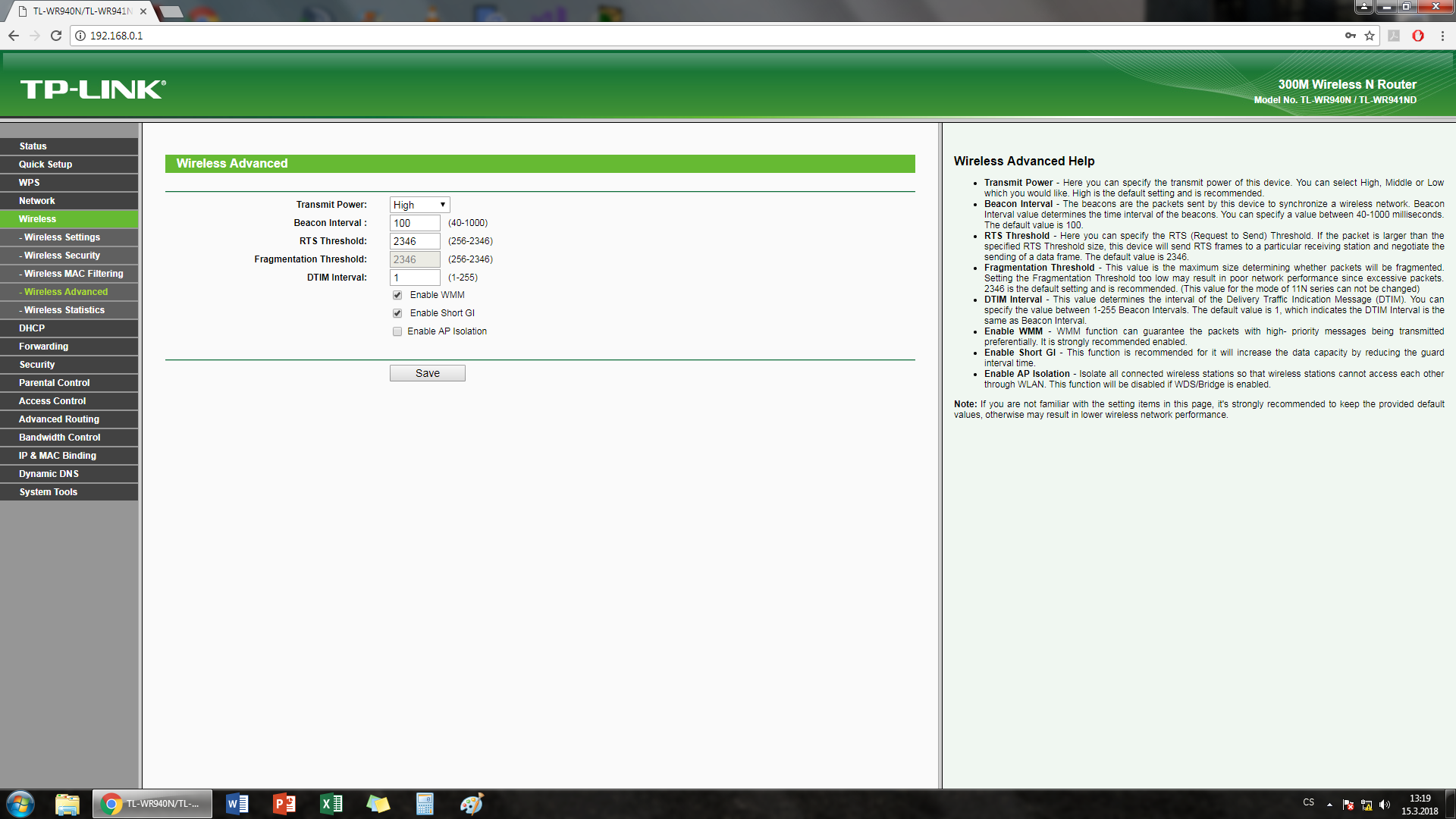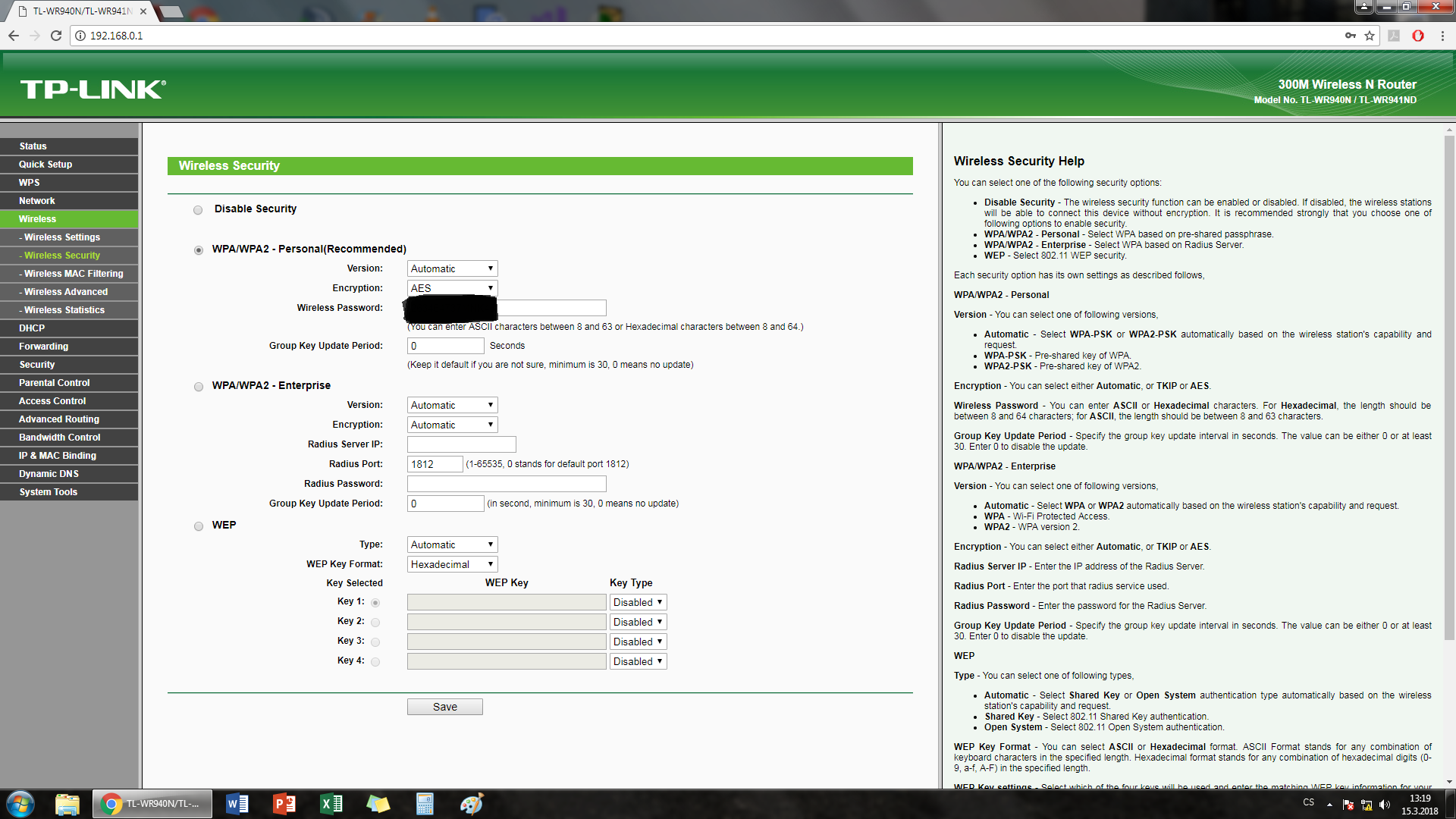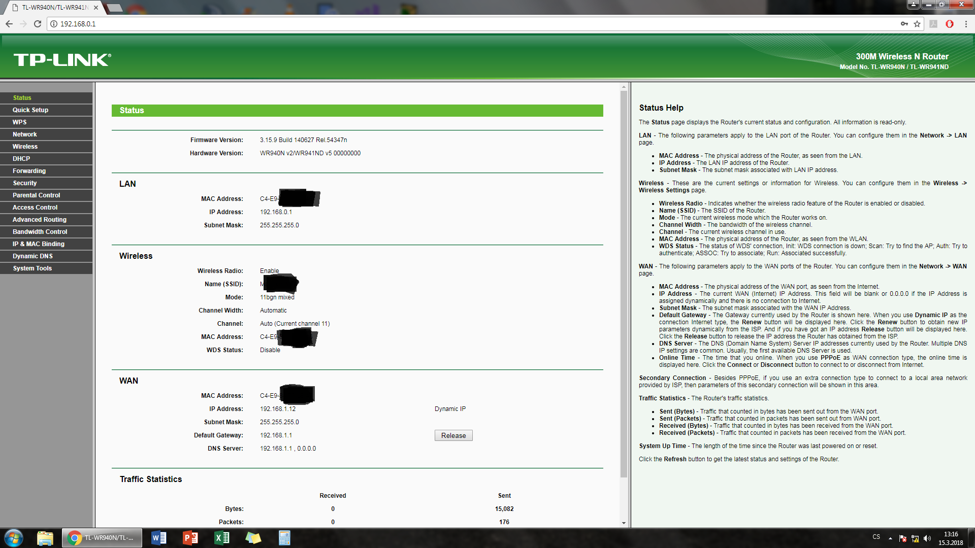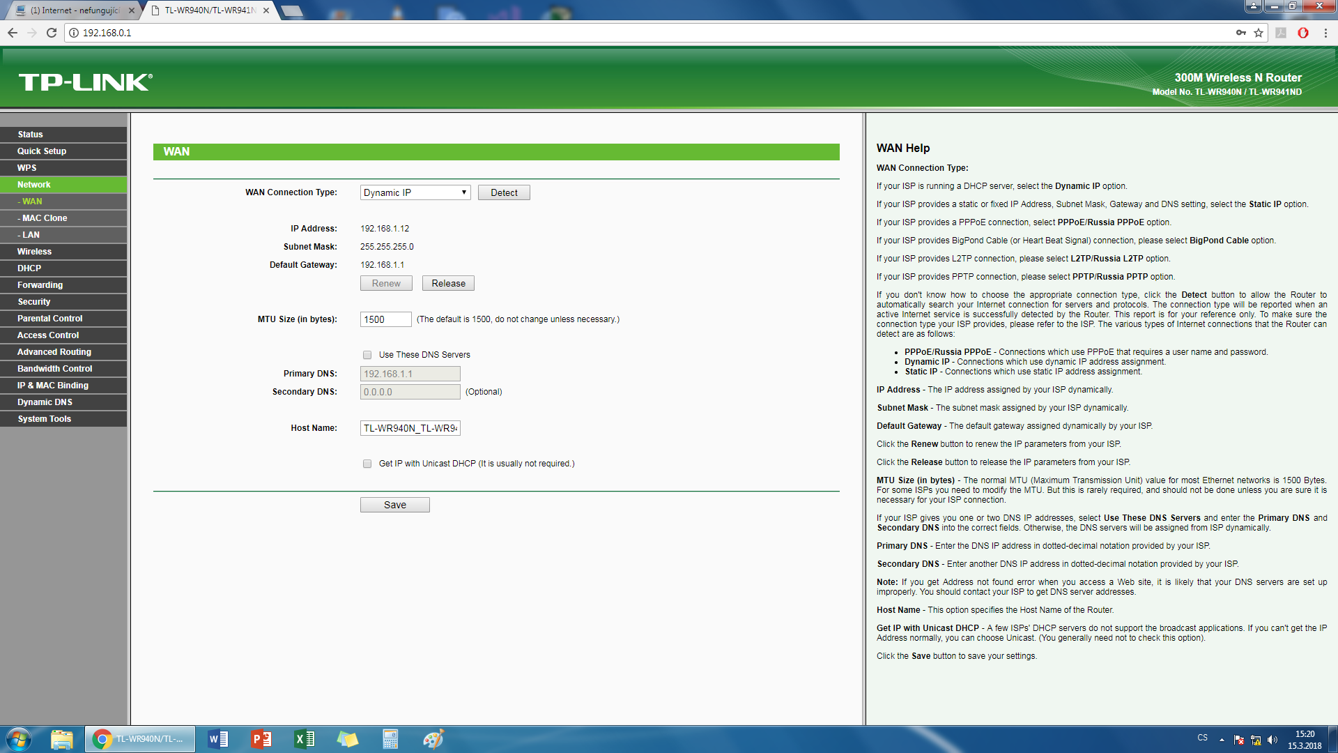 Dobrý den, bydlíme v obytném domě. Máme domácí kabelový internet. Kabel od internetu je veden do WiFi routeru (WAN) aby vytvářel bezdrátový internet. V pc WiFi kartu nemáme, takže pc je s routerem propojen dalším kabel do LAN. Včera se ale vyskytl problém. Router (TPLink TL-WR940N) nepracuje, jinak svítí. WiFI signál neroznáší (mobil, TV - internet nejde), v pc rovněž internet nejde. Internet funguje jen v tom případě, když zapojím kabel od internetu rovnou do pc. Dnes jsem omylem nahmatal a zmáčkl na zadní straně routeru tlačítko - WPS/RESET, nevím jestli jsem mu nějak tímhle ublížil, jestli jsem nějak resetoval konfiguraci, každopádně internet nešel i předtím. Prosím o pomoc, pokud byste potřebovali, vyscreenoval jsem si to konfigurační prostředí TPLinku jak a co mám nastaveno.