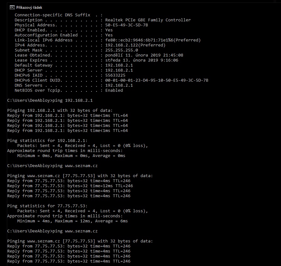 ping na router při výpadku