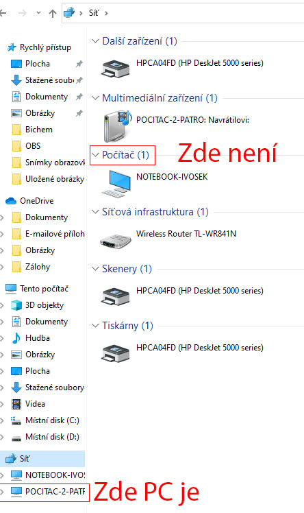 podarilo se mi jakztakz vytvorit domaci sit. V siti je jeden stolni PC pripojeny pres Ethernet a dva NB pripojene pres Wifi. Mym cilem bylo vytvorit sit, ktera by nahradila Domaci skupinu pote, co ji MS odstranil (proboha proc?). Jenze! Kdyz otevru Pruzkumnika souboru, tak tam vidim jenom ten NB a ne svuj PC. Kdyz otevru pruzkumnika na NB, tak vidim vlastni NB i sdileny PC. Proc to tak neni i na tom stolnim PC? Ani kdyz nekolikrat aktualizuji slozku Sit, tak se neobjevi. Dostanu se k nemu jenom rucne, ale to je nepohodlne. PC se take objevi v polozce Sit vlevo, ale jenom kdyz zmenim nastaveni sdileni a pak zase zmizi a uz se neobjevi. Prosim co s tim? Delam neco spatne? Kdyztak mi prosim poradte, jak tu sit vylepsit, pokud to nejak jde.