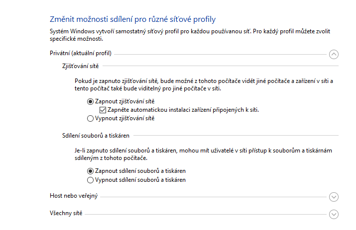 Pak vlevo klikni na "Změnit pokročilé nastavení sdílení". Rozklikni "Privátní". A zde Zkontroluj volby "Zapnout zjišťování sítě" a "Zapnout sdílení souborů a tiskáren".
