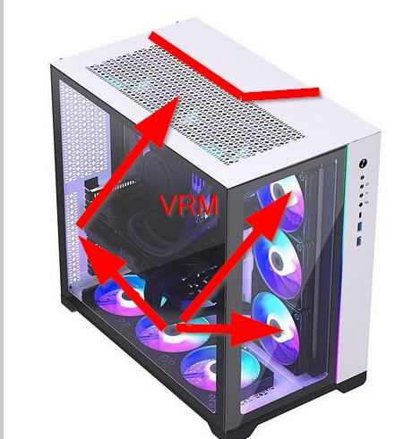 V tomto připadě zespod je ke kartě přiveden chladný vzduch, který ji obtéká a přebytečný teplý vzduch z bedny je odveden vrchníma ventilátorama navíc za pomoci i těch co jsou na radiátoru vodního chlazení.