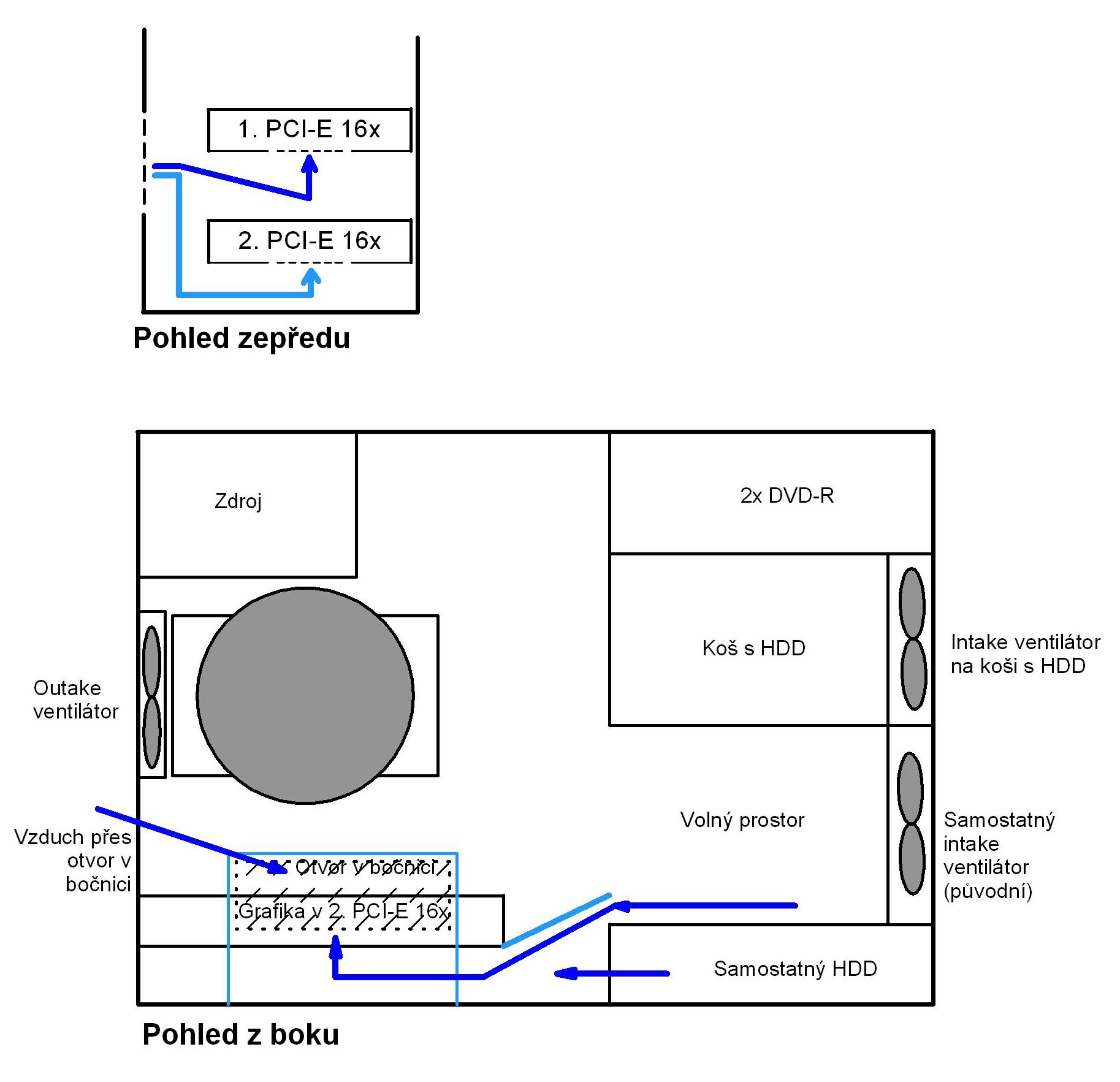 Nějak takhle jsem to myslel s tím odsávácím vzduchovodem mezi grafikou a procesorem. Provedení počítá s přesunutím koše s HDD na kolejničky, přidání větráku na koš a zaslepení průduchů v krytu garfiky tak aby všechen vzduch šel nahoru. Současně bych udělal nasávací tunely pro procesor i grafiku, aby nenatahovaly teplý vzduch ze skříně. Nákres je samozřejmě schématický. Vzduchovod bych udělal maximálně tak, aby kladl co nemenší možný odpor.