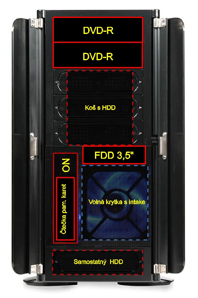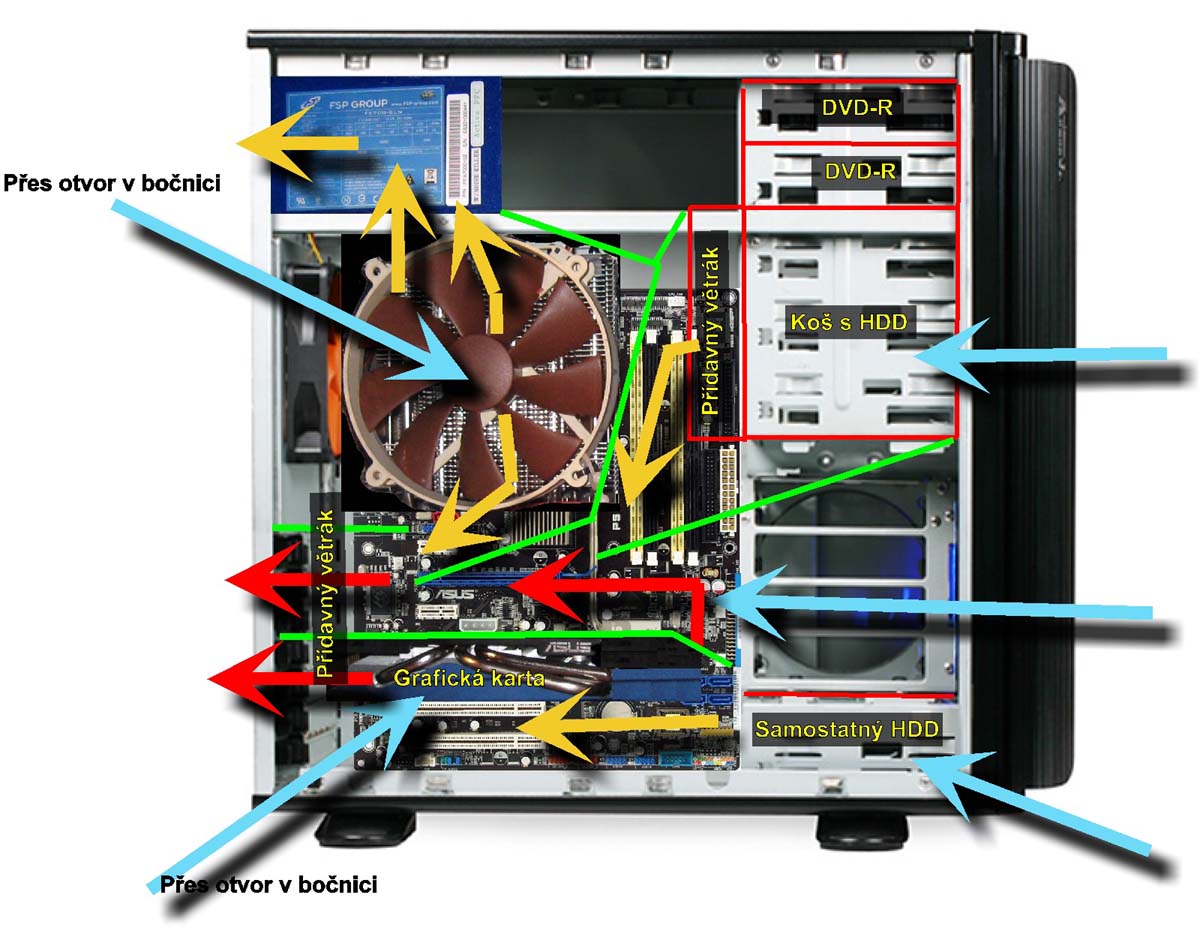 Na koši s disky bude přidělán pokud možno výkoný ventilátor, který bude chladit jednak disky samotné a částečně bude odfukovat vzduch, který bude přicházet zespodu od grafické karty a předního intake.