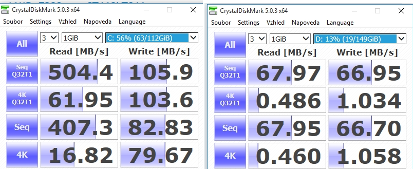 BTW tytam máš dva oddíly na SSD, nebo proč Ti stejný typ i cca stáří SSD ukazuje o 12GB menší celkovou velikost ? A nevím, jestli to udělá rozdíl, ale zkus to otestovat v 64bit verzi programu, třeba těch 10-20 bodů ztrácí program zrovna v tomhle.
