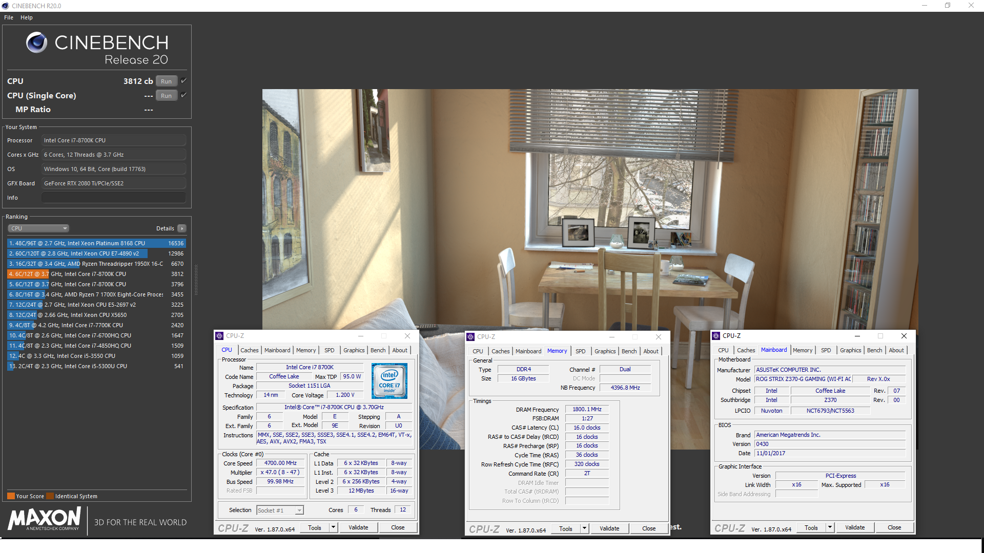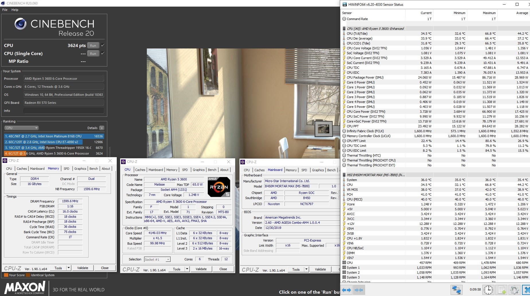 Benchmark s Ryzen 3600 + Wraith Prism, ASUS B350-i (agesa 1.0.0.4B), 2x8 GB Crucial Ballistix na 3800MHz CL 16 19 11 34 58, 1:1 IF, NZXT H200 s otevřenou bočnicí, cca 18 - 20°C.