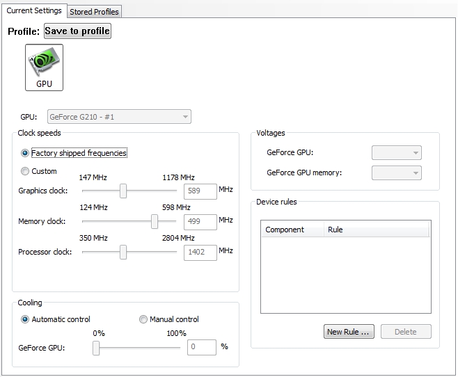 Chtěl bych nataktovat svou grafickou kartu GeForce G210. Mám na ní poměrně malý (3cm) větráček, takže spíš jen tak mírněji. Stáhl jsem nejnovější ovladače a nVidia nTune.