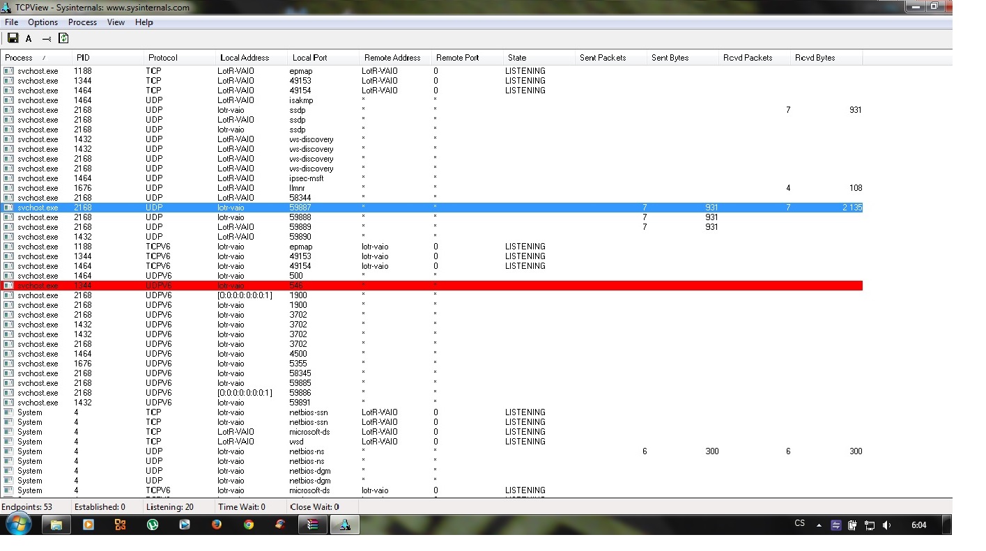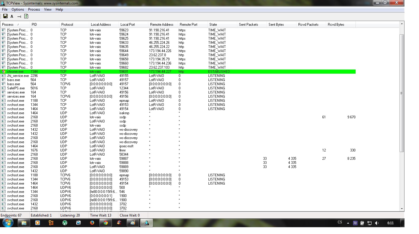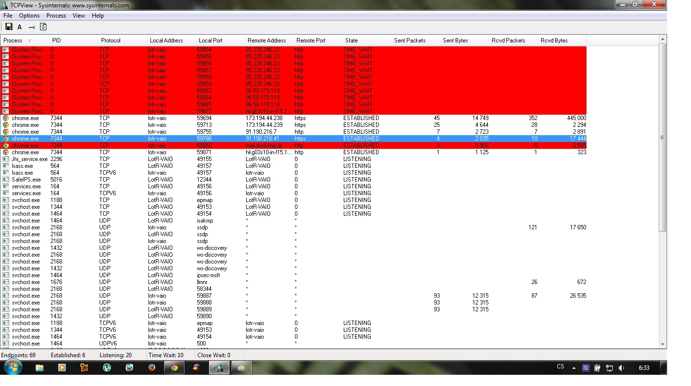 Nastuduj si, co zobrazuje TCPView a jak funguje chrome a pak se uklidnis. Na tech screenech neni nic zajimaveho. Mozna si pro zvyseni prehlednosti vypni zobrazovani 'Unconnected Endpoints'.