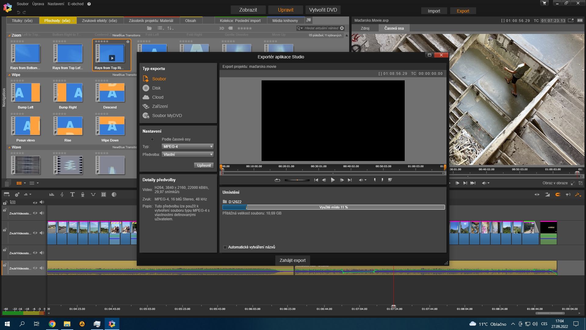 Problém však nastává, když má program zpracovat větší sousto jako je například video o délce 1 hodiny a více se spoustou přechodů u fotek. Nastavení stále stejné, zdrojové videa jsou ve formátu mp4 s rozlišením 4K na 30fps a datový tok 60Mbit/s. Render mám nastaven na stejný formát mp4, rozlišení 4K 30fps a datový tok 40Mbit/s potažmo maximu, co Pinnacle dovolí. Export vždy proběhne celý, nezasekne se nic ani po dokončení, nevyskočí chyba, vše proběhne, ale ve složce vždy najdu jen soubor, který není možné otevřít a má špatný název, jakoby Pinnacle zapomněl dokončit soubor (viz druhý obrázek). Update nepomohl, render v jiném formátu, vůbec nic nepomáhá.