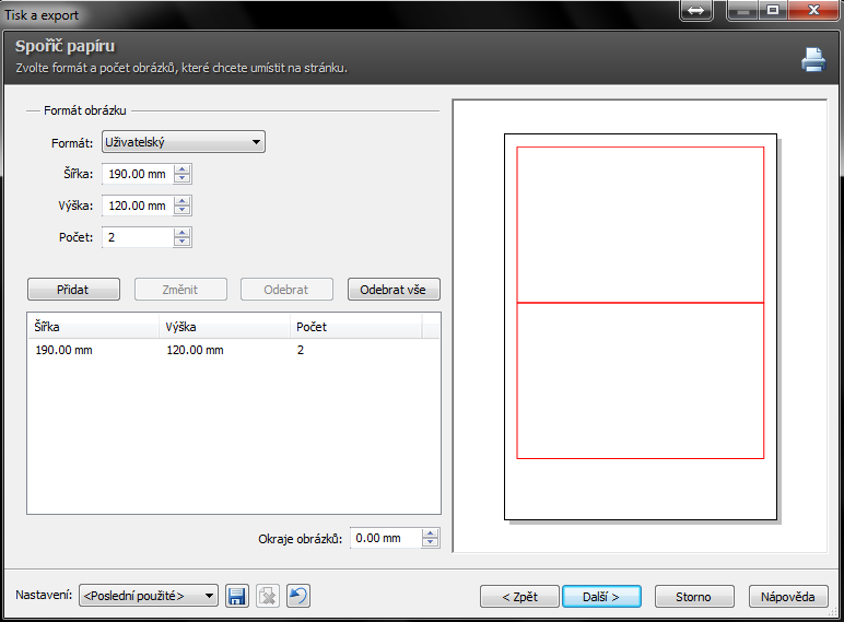 Zkusil bych Zoner Photo Studio, mají i zkušební verzi. A tam je tisk dle tvých parametrů (. Já když třeba tisknu fotky, tak si je díky tomu naskládám na A4.