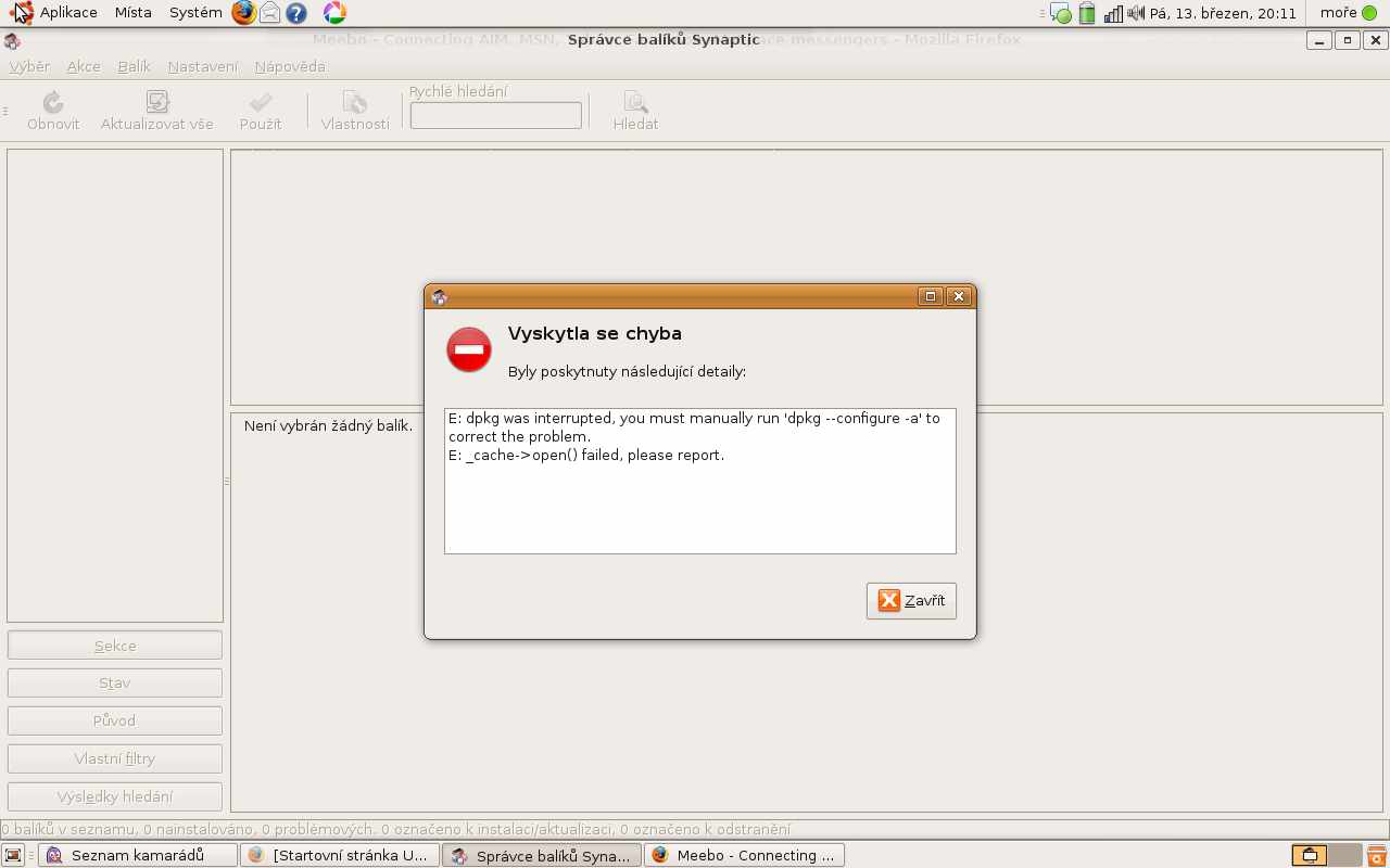 no..pisou tam..ze to mas zadat rucne..... tak zadej prikaz : sudo dpkg --configure -a /sudo sou ty prava