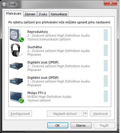 Zde je vidět, že pro zvuk se použije TV, ale skype bude stále používat repro.