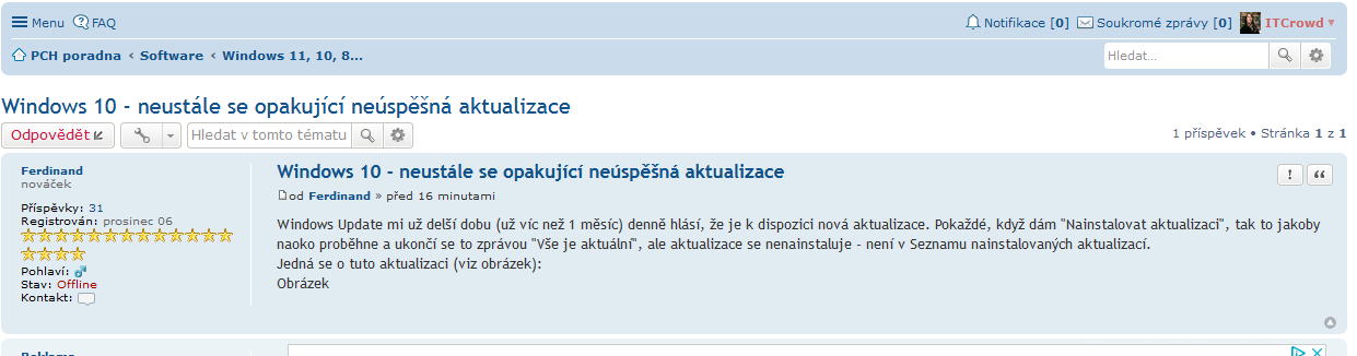 Windows Update mi už delší dobu (už víc než 1 měsíc) denně hlásí, že je k dispozici nová aktualizace. Pokaždé, když dám "Nainstalovat aktualizaci", tak to jakoby naoko proběhne a ukončí se to zprávou "Vše je aktuální", ale aktualizace se nenainstaluje - není v Seznamu nainstalovaných aktualizací.