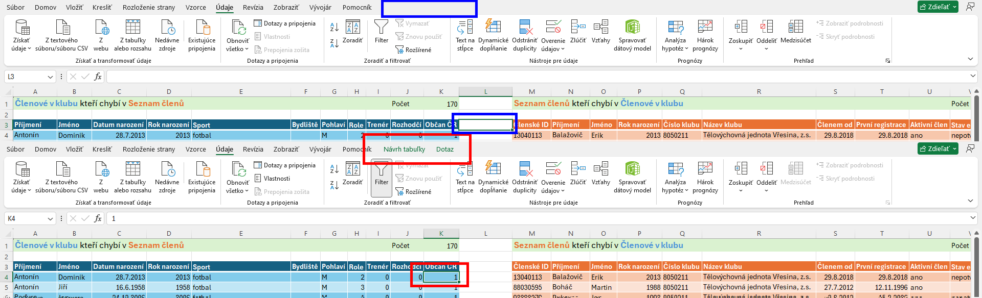 A z tech tvych excelu bych vytvoril seznamy treba tak, ze bych pomoci CONCAT spojil prijmeni, jmeno a treba rok narozeni. A to pak porovnal. Jen je to potreba jeste trochu projit rucne, protoze kdyz tam je treba v jednom seznamu jmeno s "č" a ve druhem s "c", tak to shodu samozrejme nenajde.