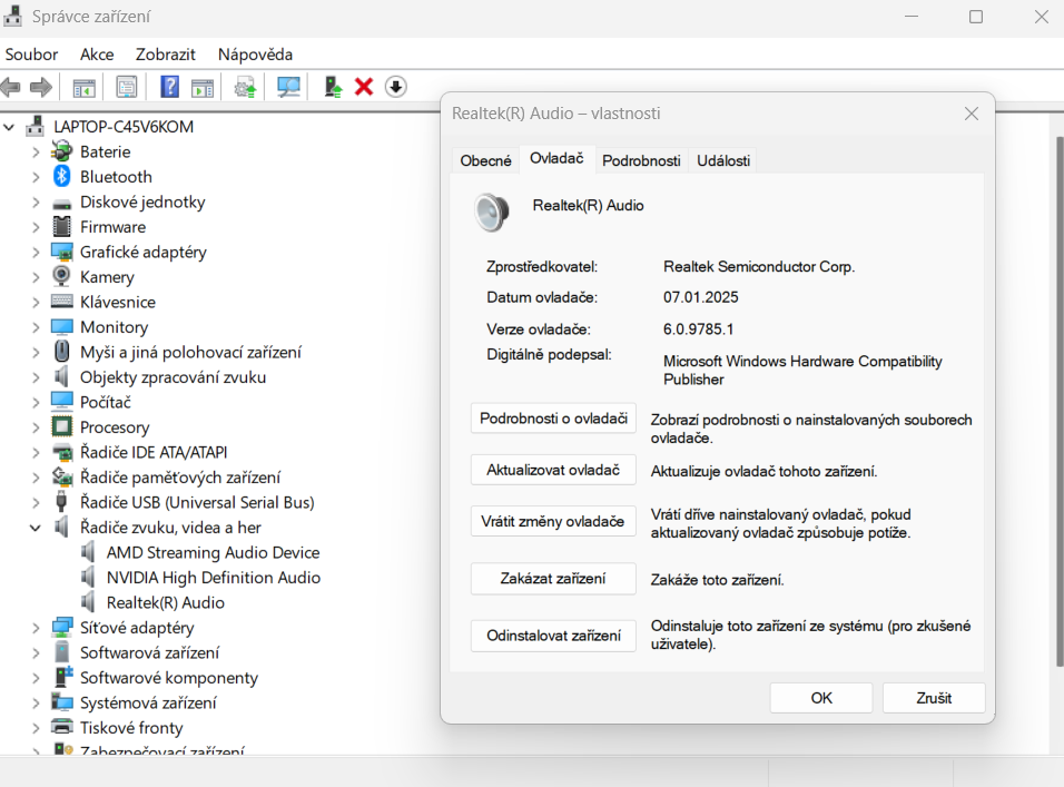 Nainstaloval jsem ovladač z toho odkazu a aktuální verzi to tam psalo ze 7.1.2025, což stejné datum ukazuje i windows. Opět, žádná změna. Já vás opravdu nechci s takovou hloupostí zatěžovat, přijde mi to až trapné, ale trápím se nad tím už pár dní sám a už nevím, co můžu ještě vyzkoušet.