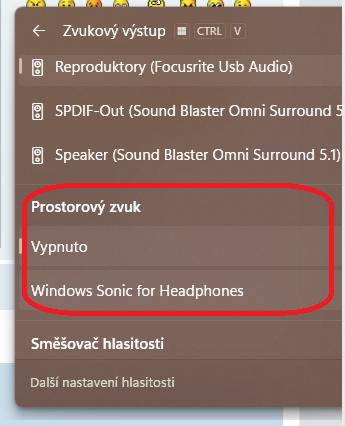 EDIT.Výrazem suchý označují zvukaři zvuk bez dozvuku (prostoru, hallu). Neměl jsi před reinstalací W 11 zapnutý Prostorový zvuk v nastavení zvuku - klik na ikonu repro vpravo dole > klik vpravo od posuvného regulátoru hlasitosti > dál viz obrázek?Zvuk mi přijde takový ''suchý'',