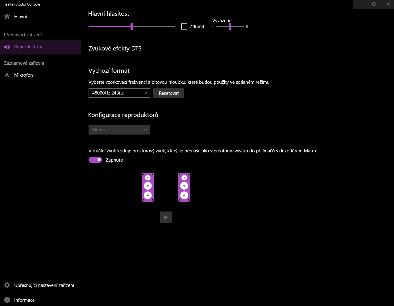 Po reinstalaci se v počítači sama objevila aplikace Realtek Audio Console, ve které jsem pochopil, že se něco málo přenastavit asi dá, ale i okem laika bych řekl, že toho moc není. Přikládám také screenshot.JuRas píše:Instalací jiných i novějších ovladačů nedosáhneš lepšího zvuku když repra v ntb nestojí za nic. Sluchátka by totiž hrály podobně a to se neděje. To, že ti předtím hrálo repro lépe bylo pravděpodobně způsobeno zavedeným zvukovým profilem s equalizací. Buď je to součásti soft. balíku s drivery a nebo se instaluje samostatně. Bohužel zřejmě nevíš cos tam měl nainstalované a co ne. Na stránkách podpory výrobce je pár odkazů na aplikace, které mají se zvukem co dělat. Např. DTS Component Driver, Realtek Codec Console(Realtek Audio Driver Hardware Support App), DTS Headphone X v1 UWP. Nevím co z toho bude mít vliv a co ne. Možná to jsou jen zbytečnosti. Třeba už to máš nainstalované, nevím. Je třeba se podívat i na nastavení zvukovky v nastavení, systém zvuk, případně další nastavení zvuku.