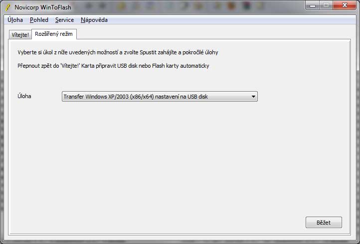 Nejdříve si stáhneme program [url=http://<www.slunecnice.cz/sw/wintoflash/>]WinToFlash[/url]. Rozbalíme do libovolného adresáře a spustíme. Úvodní obrazovku přeskočíme a zvolíme Rozšířený režim, kde vybereme požadovanou úlohu.