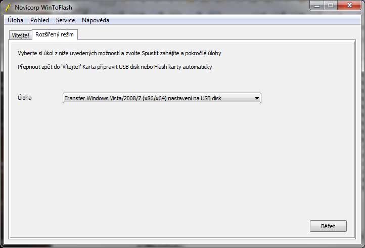 Nejdříve si stáhneme program [url=http://<www.slunecnice.cz/sw/wintoflash/>]WinToFlash[/url]. Rozbalíme do libovolného adresáře a spustíme. Úvodní obrazovku přeskočíme a zvolíme Rozšířený režim, kde vybereme požadovanou úlohu.