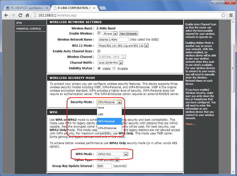 WEP šifrování je z bezpečnostního hlediska za zenitem a nelze jej považovat za skutečnou ochranu Wi-Fi sítě. Prolomit jej lze doslova za pár minut. Návody k tomu jsou k dohledání na Internetu. Vybírat lze tedy z WPA nebo WPA2. Nejlepší volbou je samozřejmě novější WPA2 šifrování, nicméně některá starší zařízení s podporou Wi-Fi s ním nejsou kompatibilní. Pak se sahá po WPA šifrování.