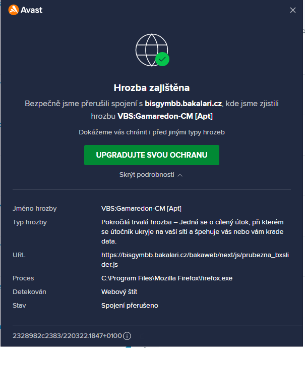 Dobrá rada. Ale keď vidím Avast, spolu s Firefox (teda aj kontrolu v prehliadači) a nevieme, aký má OS (asi W10) - tak by to mohla byť aj falošná hrozba - Avast je týmto známy.