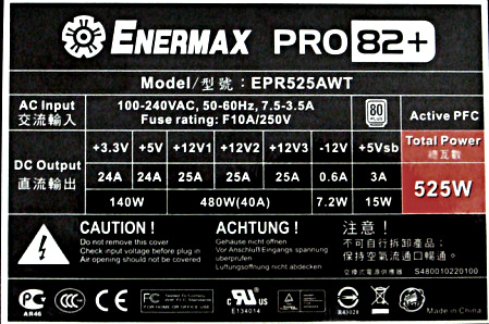 Důležité jsou však nejen Waty,ale hlavně hodnata ampérů na +12V větvi.Ta je označena na boku zdroje na štítku.Na obrázku níže je označena červeně.Hodnota 38A je dostatečná i pro středně výkonný herní počítač.