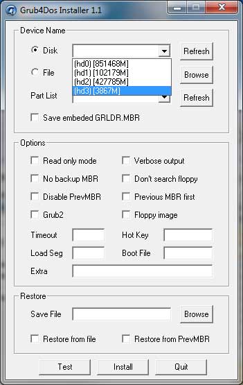Dalším krokem bude stažení a instalace Grub4Dos - Step 3. Opět rozbalíme. Spustíme grubinst_gui a vybereme disk (flash). Pro zjednodušení - číslo disku je shodné s číslem disku ve správci disků - tedy Disk3 = hd3:
