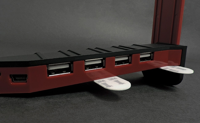 Na horní ploše tohoto doplňku se pak nachází samotné rameno tmavě cihlové barvy pro zavěšení sluchátek. Je otočné o devadesát stupňů, takže sluchátka lze nechat viset vpravo vedle monitoru nebo za monitorem. A to není všechno. Věšák zároveň funguje jako USB rozbočovač se čtyřmi porty USB 2.0. Pro dosažení vyšší spolehlivosti rozbočovače je podporováno nezávislé napájení z elektrické sítě, ale potřebný adaptér není bohužel součástí balení.