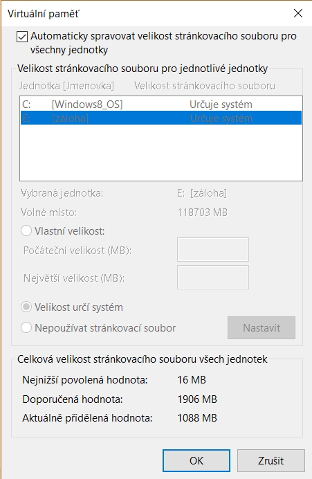 Stránkovací soubor mám nastavený na auto velikost viz. foto. Verzi Biosu jsem vyčetl Lenovo J9ET92WW (2.12). tak jsem se díval na podporu lenova a našel jsem jen BIOS Update pro W8.1 a nižší. Tak teď nevím :( (http://support.lenovo.com/cz/cs/downloads/ds037208)Oxxid píše:Tady to vypadá dobře. Stránkovací soubor máš zapnutý? Skrze HWInfo / CPU-Z zjisti aktuální verzi BIOSu a podívej se na stránky výrobce, zda-li není k dispozici jeho aktualizovaná verze.