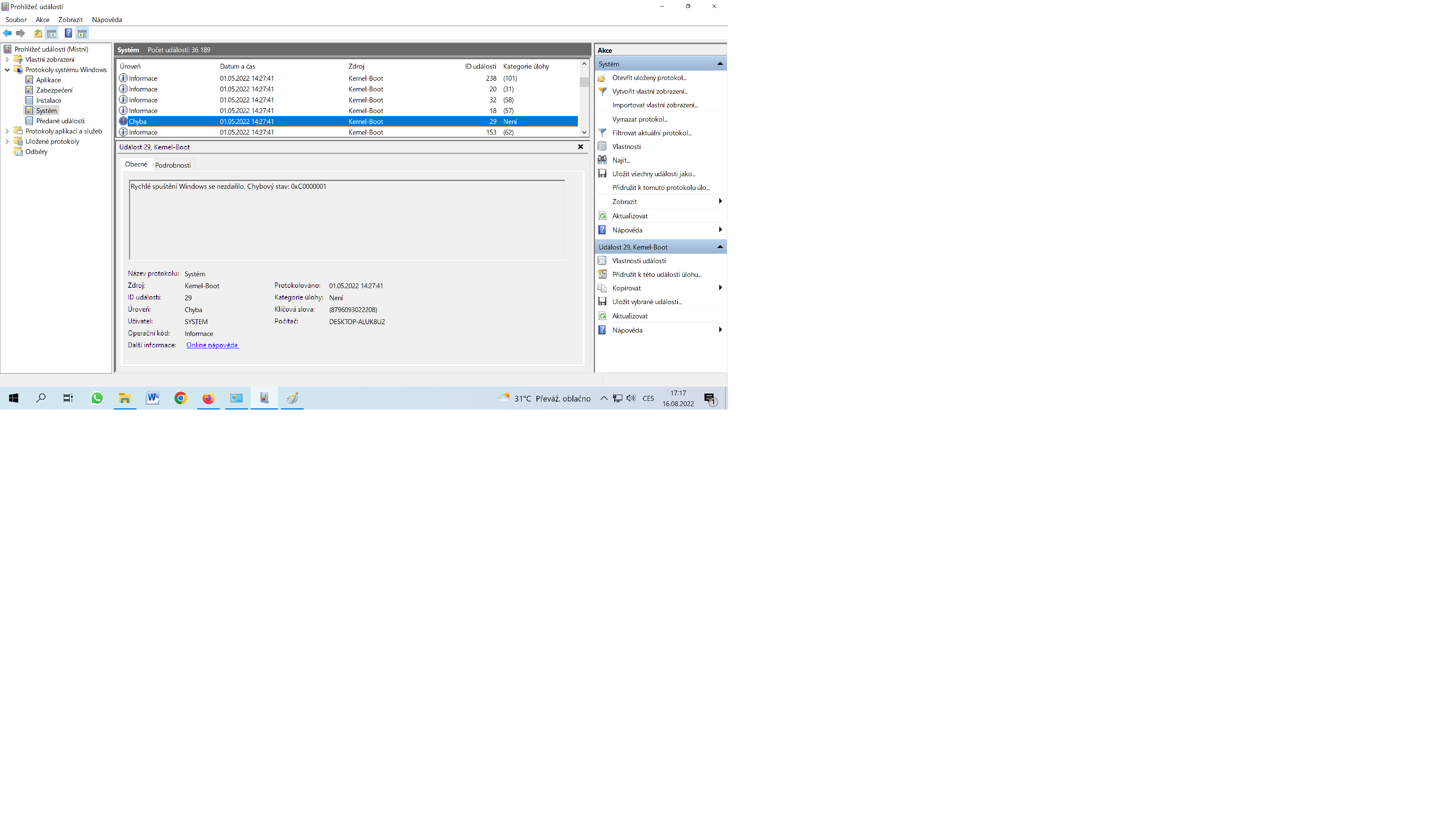 Tak tohle bylo v prohlížeci událostí. Snad se z toho dá něco vyčíst.