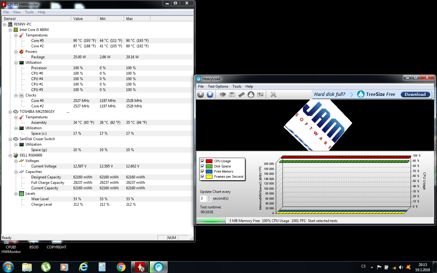 Tak jsem doma úspěšně pustil NTB a udělal ty logy a výstup z CrystalDisk (stav HDD = špatný). Spustil jsem současně ty dva nástroje na zátěž a sledování teplot, ale kleklo to (slabá baterka, nic už nevydrží, je to neustále napojený do sítě, což může být taky ten problém). Při dalším spuštění už to hází chybu o nepřístupným disku: