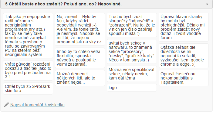 Díky moc Clorkymu za vymyšlení a zorganizování této pohodové ankety, zároveň díky všem, co se zapojili a poctivě vyplnili. Je moc fajn vidět, že "strategický" přechod na v3.1 je vnímán z většiny pozitivně. Připomínky jsem si poctivě pročetl, pokusím se alespoň některým z nich vyhovět.