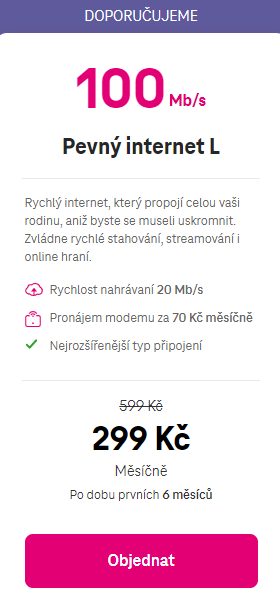 Mám na výběr jen z operátorů a nejlépe mi vycházel T-mobile s názvem Pevný internet L 100/20 Mbit. Tak bych byl rád za zkušenosti. Díky.