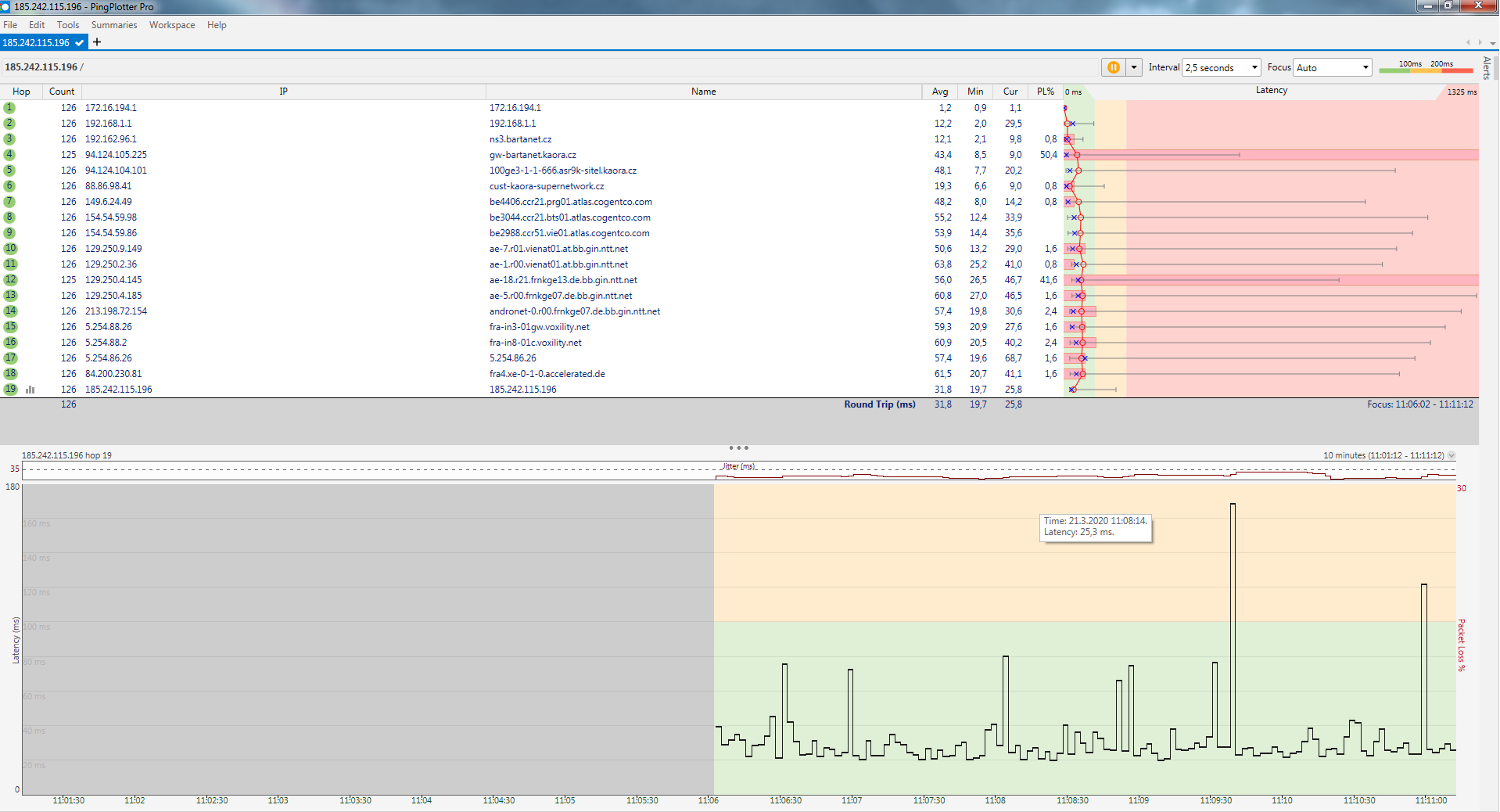 Ve screenu pingplotter se jedná o první hop, tedy kontak na 172.16.194.1. Při připojení kabelem zde musí být 0% ztracených paketů - položka PL%.