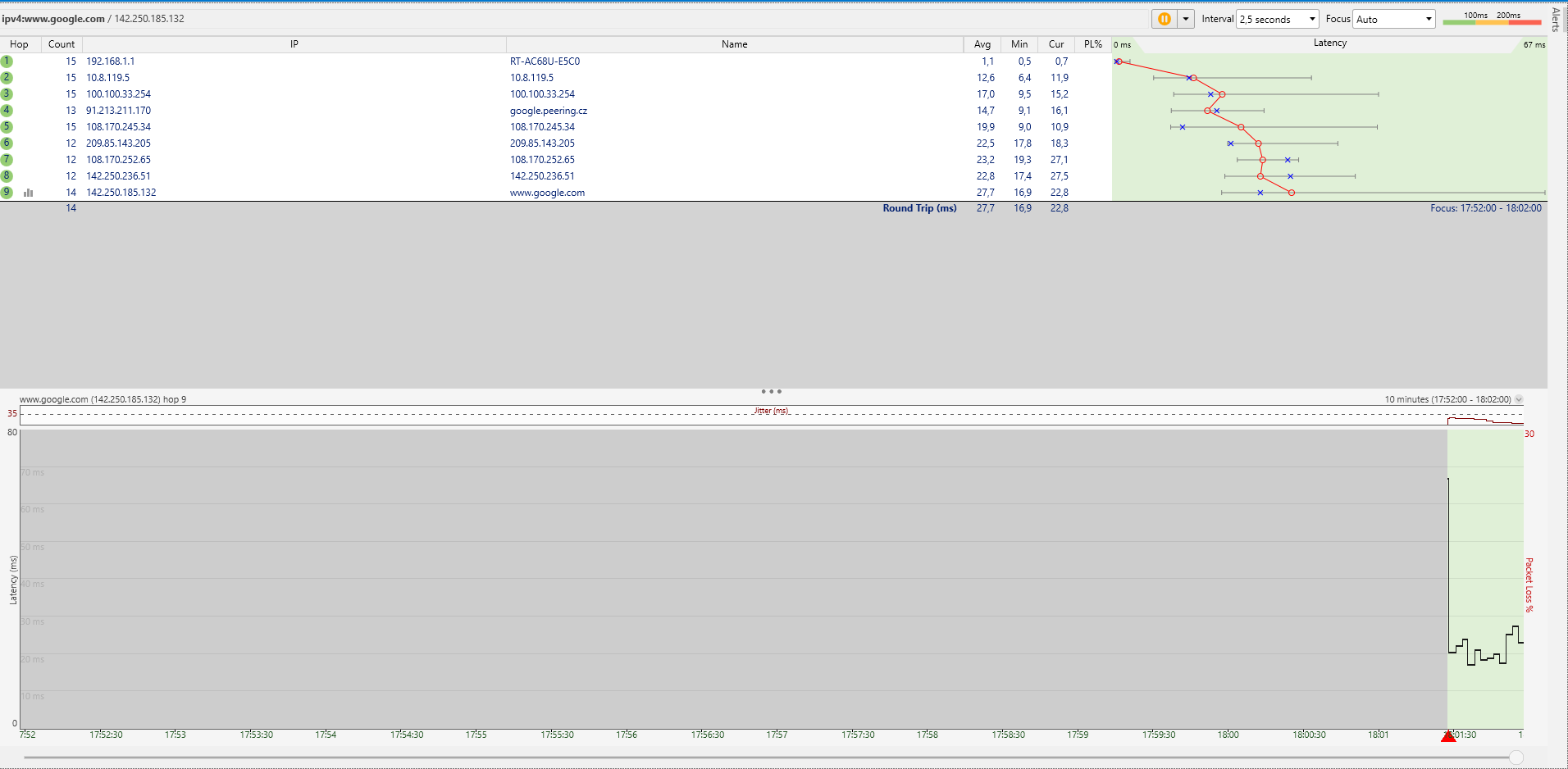 OK. Nech IPv6 vypnutý. Spusť pingplotter a dej ten gůglí test rychlosti.