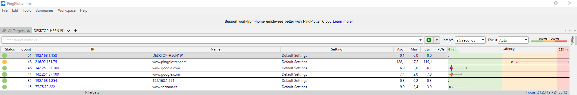 Prvni radka v Ping plotteru. Lokalni IP PC a packet loss.
